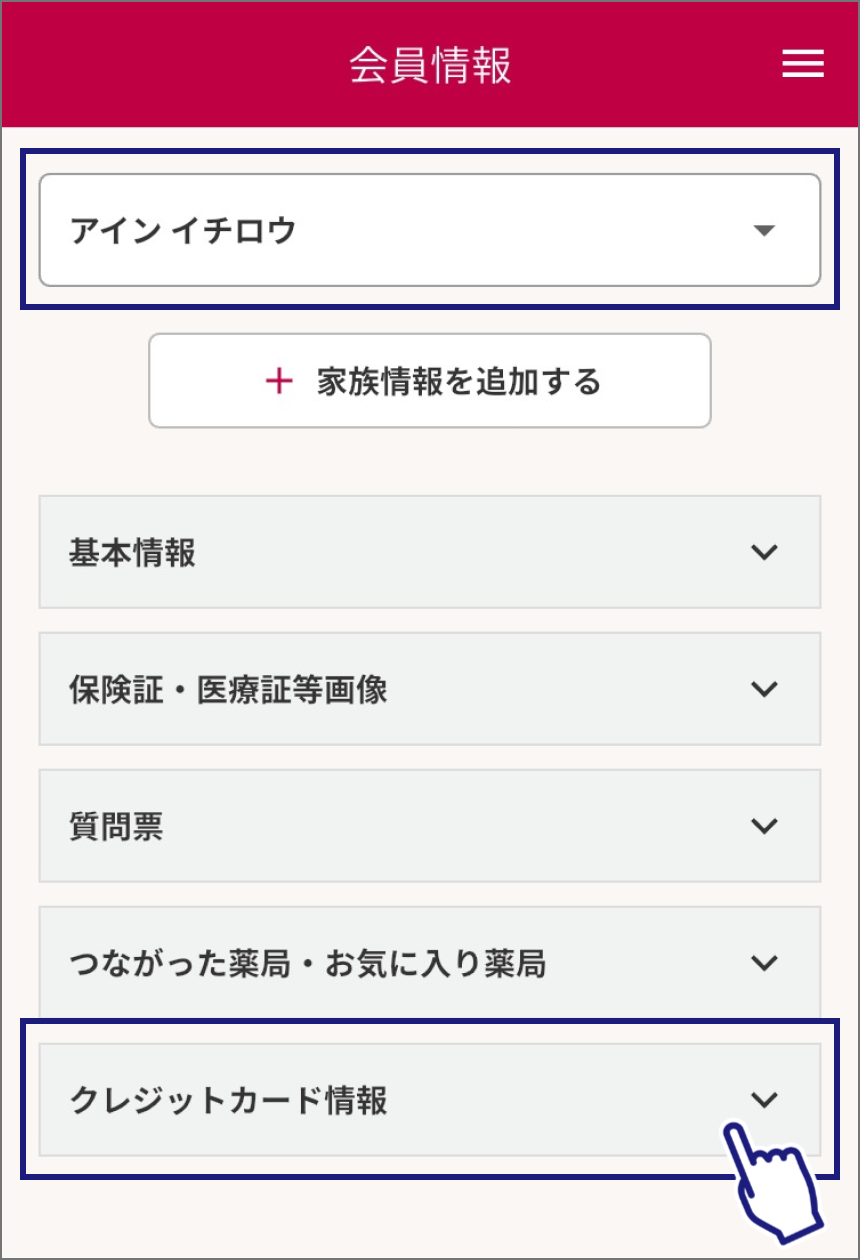 本人会員のアカウントを選択し、「クレジットカード情報」をタップします。