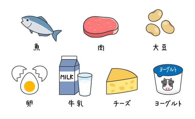 魚類、肉類、大豆製品(豆腐、納豆など)、卵、乳製品(牛乳、チーズ、ヨーグルト)