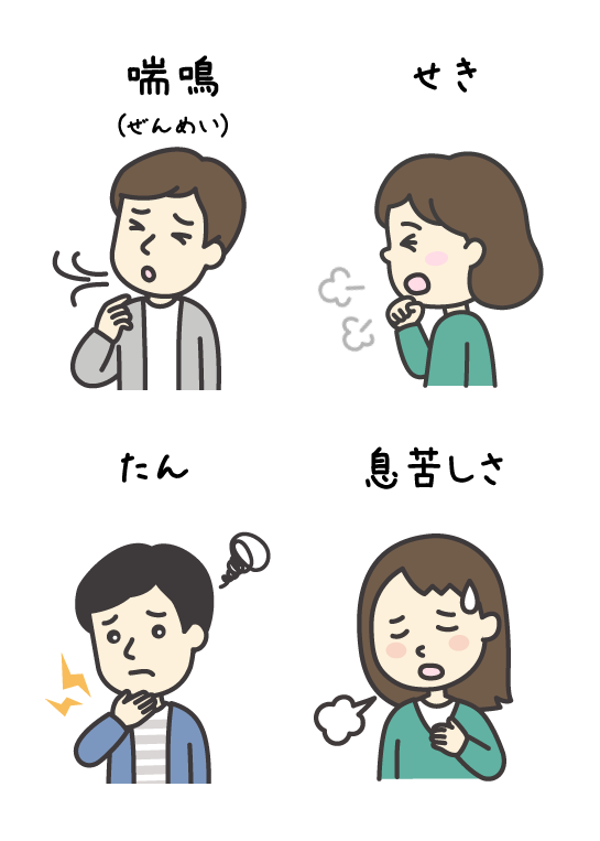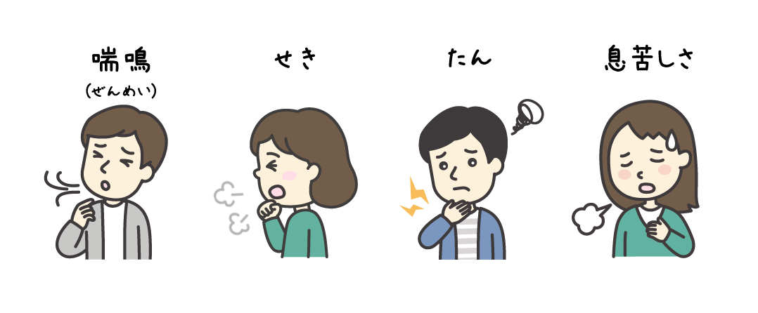少しの刺激でも気道が敏感に反応しやすく、刺激によって気道が狭くなり喘息の発作が起こります。せきと息をするときにぜいぜい、ヒューヒューといった音がする喘鳴(ぜんめい)が特徴的な症状です。