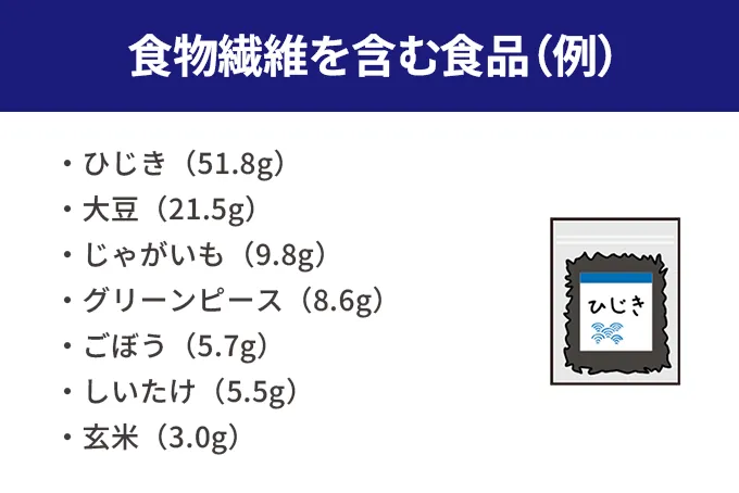 食物繊維は、海藻類、豆類、いも類、野菜、きのこ類、穀類に多く含まれており、成人(30~64歳)の1日当たりの摂取量目安は、男性22g以上、女性18g以上です。