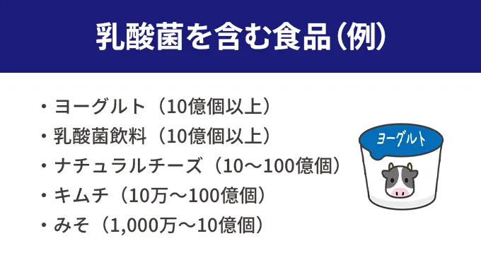 乳酸菌は、ヨーグルトや納豆などの発酵食品に多く含まれる善玉菌です。生きて腸に届いた乳酸菌は乳酸を作って腸内の環境を弱酸性にし、悪玉菌の増殖を抑えて腸内環境を整えます。