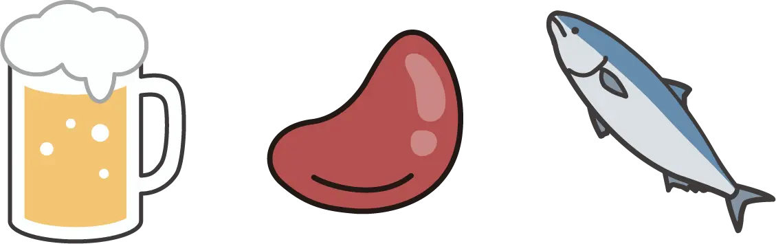 これらの食事や嗜好品には、尿酸の生成を促し、排出を妨げるという影響があり、痛風のリスクを大きく高めます。