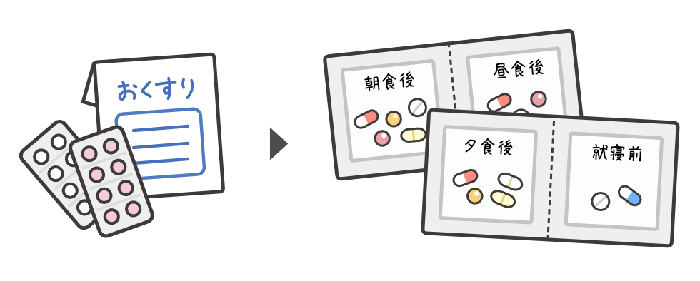 - 服用している薬の種類が多い(例:朝2種類、昼3種類、夜4種類)