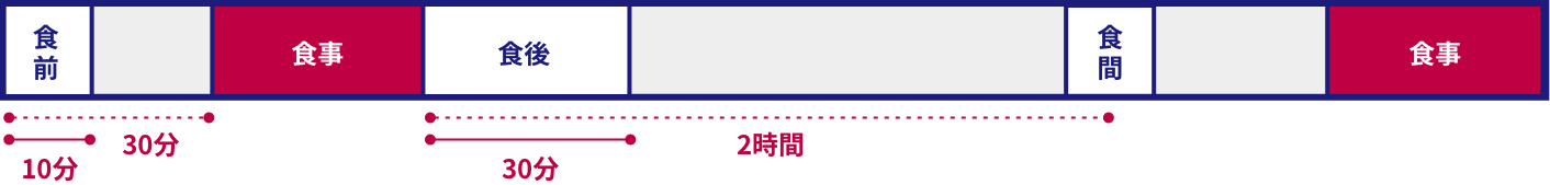 - 食間 : 食事と食事の間、前の食事から約2時間後(食事の最中ではありません)