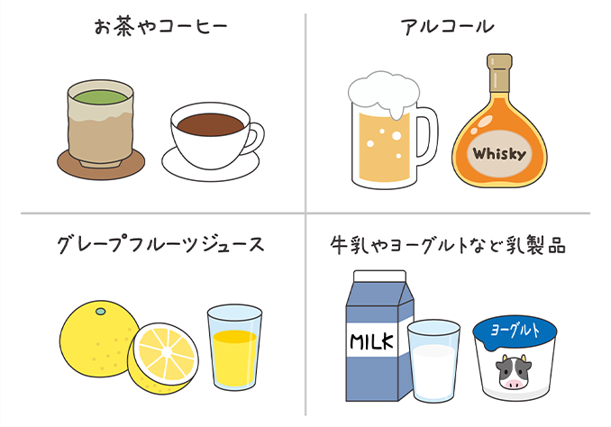 - お茶やコーヒー : カフェインの影響で作用が強まったり吸収されにくくなる可能性がある